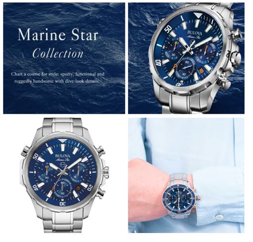 Treat yourself to a men’s Bulova watch from the Marine Star Collection in stainless steel with silver-tone finish and a blue dial. This Marine Star has a six-hand calendar chronograph, luminescent markers and is water resistant to 100 meters.