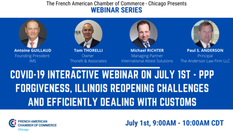 International Management Solutions, Thorelli & AssociatesInternational Attest Solutions, LLC, and The Anderson Law Firm, LLC are organizing an interactive webinar to help businesses assess the challenges of reopening worksites in Illinois, as well as the impact of Coronavirus on their US operations or their plans for US expansion. This webinar is also an opportunity to get information on the PPP loan forgiveness.  Antoine Guillaud, President at IMSTom Thorelli, Partner/Owner, Thorelli & Associates; Michael Richter, Managing Director, International Attest Solutions LLC; and Paul S. Anderson, Principal, The Anderson Law Firm, LLC,  will present.
